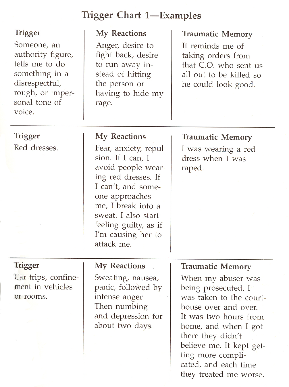 In the third column, try to trace the trigger to the original traumatic event, to a secondary wounding experience, or to an event associated with these experiences. If you cannot remember the original events, do not be overly concerned. The main point of completing this chart is to help you to understand and anticipate when you might be triggered. This understanding is the first step toward change and toward control.