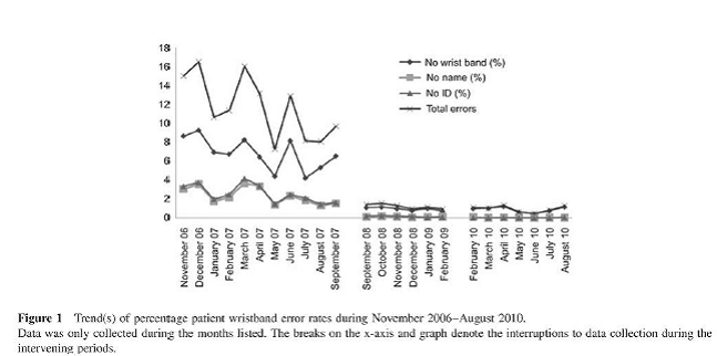 Correct patient identification is the cornerstone of patient safety in any healthcare setting. With interdisciplinary cooperation, continuous monitoring and patient safety educational activities, patient wristband error rates can be reduced from 10.6% to 16.5% and sustained at levels of 0.4%–1.4%.