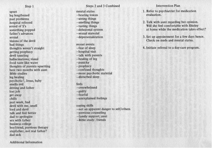 Counselor: What happened yesterday that made you feel so upset? Client: I kept seeing visions of the devil. Day before yesterday I went in the bathroom, and I looked in the mirror and it was red, you know. Like a cat’s face. And yesterday it was black, and thoughts kept going through my mind. Counselor: Thoughts of. Client: Just bad things, like talking real sharp to everybody and just being real mean. . . . The more I talked about it, the worse it got. I started to panic and couldn’t breathe, and my chest started hurting, and my stomach started getting sick, and I was getting headaches. But all this has gotten worse since that thing popped in my ear. Counselor: What finally made you decide to go to the hospital last night? Client: My thoughts weren’t straight. They were confused. I kept getting a prophecy, and I kept writing down everything that came to my mind. My aunt says that that’s not right. So she called a pastor. So I talked to him, and then when I got real bad he came over and tried to talk to me about it some more. Then I felt at peace about it and went to sleep, but then the next morning I was back the same way again. . . . Just like the devil was on the outside of me this time—you know—and he was trying to get in there and taunt me of those pasts that I have had.