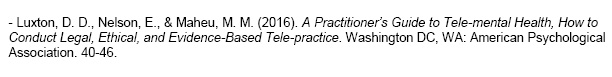 Barnett, J. E., & Kolmes, K. (2016). The practice of tele-mental health: Ethical, legal, and clinical issues for practitioners.Practice Innovations, 1(1), 53–66.